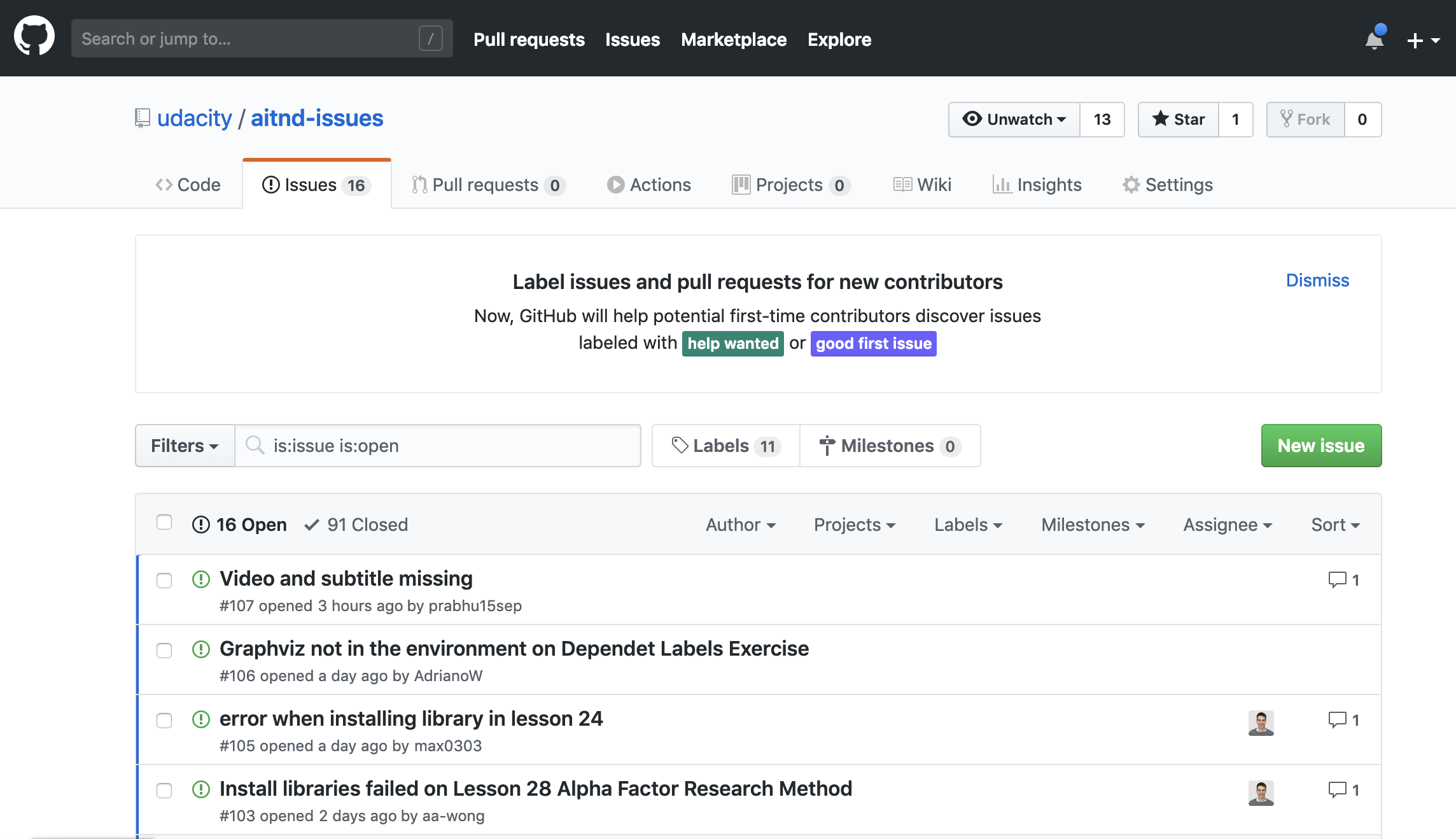 If you find an error, check the issues list to see if it has already been filed. If it hasn't, you can file an issue by clicking on the "New issue" button, adding a title, and entering a description in the details (you will need a GitHub account for this).