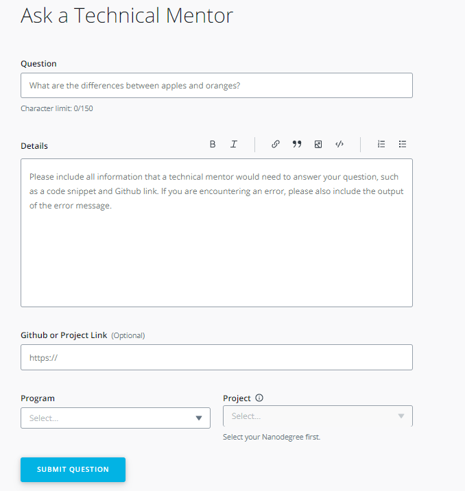 • Provide Details and Links: explaining what (if anything) you’ve already attempted to solve the problem helps mentors know where to start when answering your question. Likewise, if your question is not related specifically to a project, but rather to an exercise, quiz, or lesson, it’s helpful to include information such as lesson or quiz name, screenshots, and classroom links.