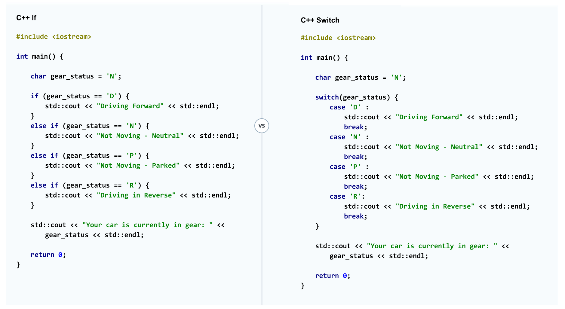 Since there is no Python switch statement, we will compare a set of if-else C++ clauses with a C++ switch statement.