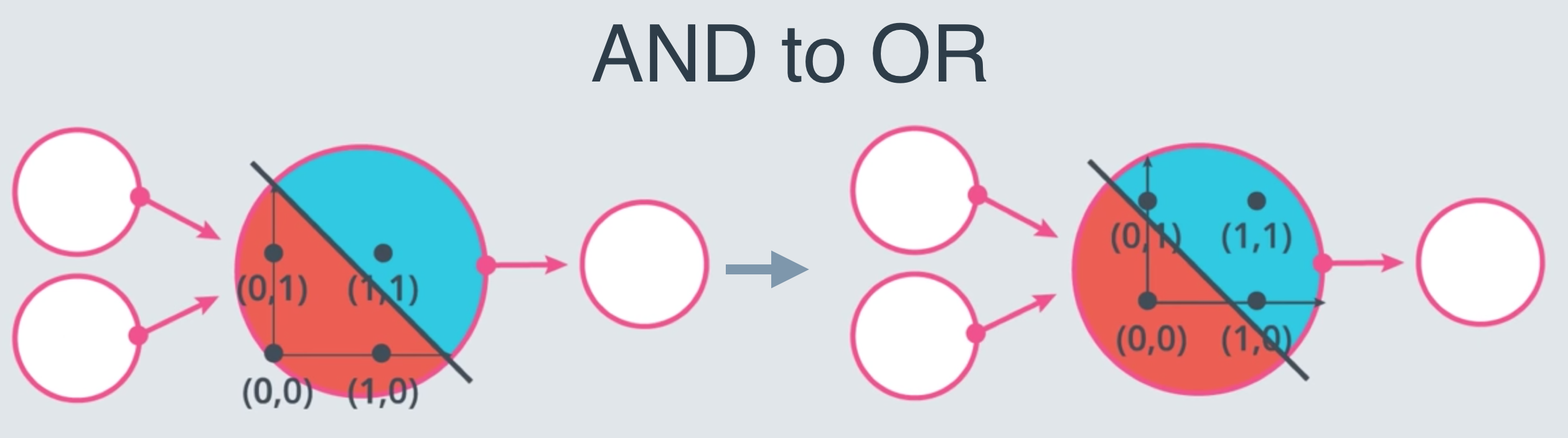 The OR perceptron is very similar to an AND perceptron. In the image below, the OR perceptron has the same line as the AND perceptron, except the line is shifted down. What can you do to the weights and/or bias to achieve this? Use the following AND perceptron to create an OR Perceptron.