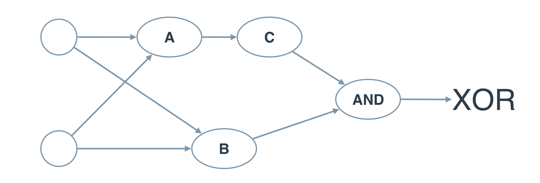 The neural network below contains 3 perceptrons, A, B, and C. The last one (AND) has been given for you. The input to the neural network is from the first node. The output comes out of the last node.