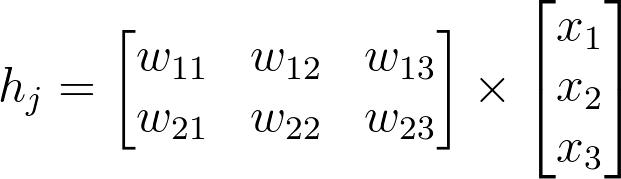 But now, the weights need to be stored in a matrix , indexed as w_{ij} . Each row in the matrix will correspond to the weights leading out of a single input unit , and each column will correspond to the weights leading in to a single hidden unit . For our three input units and two hidden units, the weights matrix looks like this: