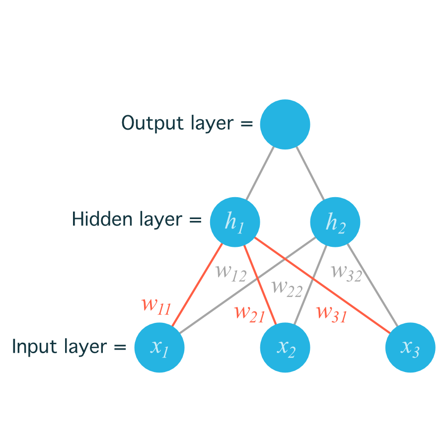 For example, the following image shows our network, with its input units labeled x_1, x_2, and x_3 , and its hidden nodes labeled h_1 and h_2 :