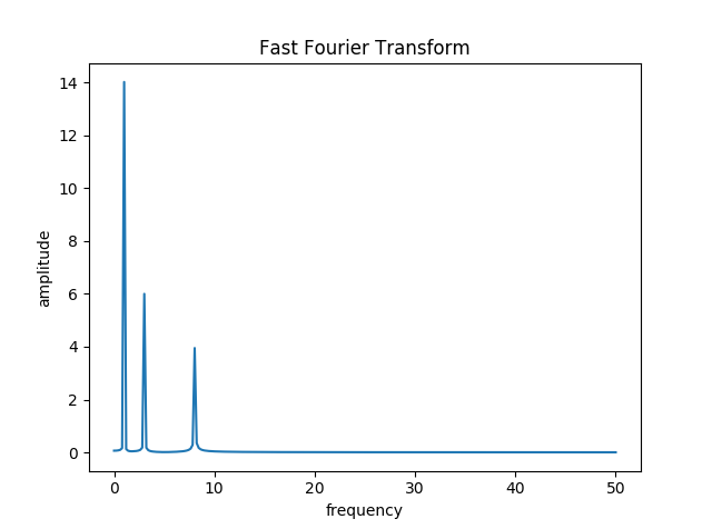 This FFT algorithm will create both positive and negative values, but we'll just display the positive ones. When you're done, you should see something like the following, showing peaks at the three frequency values originally provided!